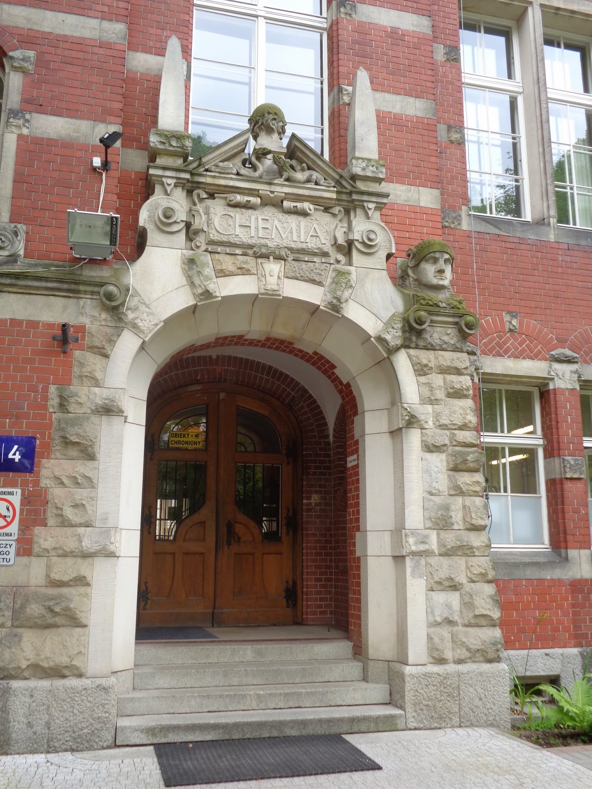 Przechodząc przed Wydział Chemiczny, który jako jedyny ma swój osobny budynek, obecni dowiedzieli się więcej na temat ciekawego portalu wejściowego. Sfinks pilnuje wejścia do świątyni, kojarzy się przecież z trudnymi pytaniami, z boku mamy przedstawiony dialog salamandry (ogień) z wężem (trucizna), zaś górę wieńczy kula w płomieniach. Tuż obok jest audytorium, które jak twierdzi Pan Masłowski, jest jednym z najpiękniejszych w jakich miał okazję być. Pobudziło to moją ciekawość.