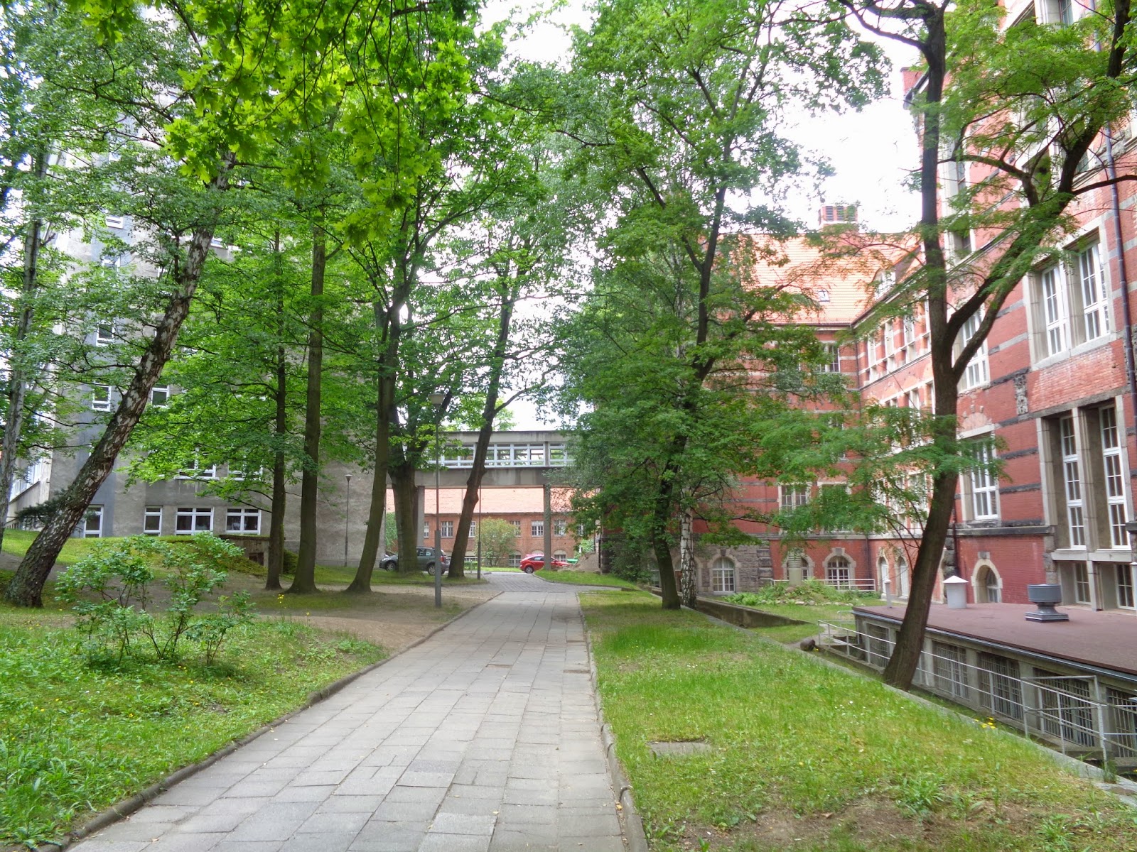 Za drzewami widać nijak pasujący tutaj Gmach B. W ten sposób budowano po wojnie, nie dbając nic a nic o dopasowanie się do zastanej architektury.