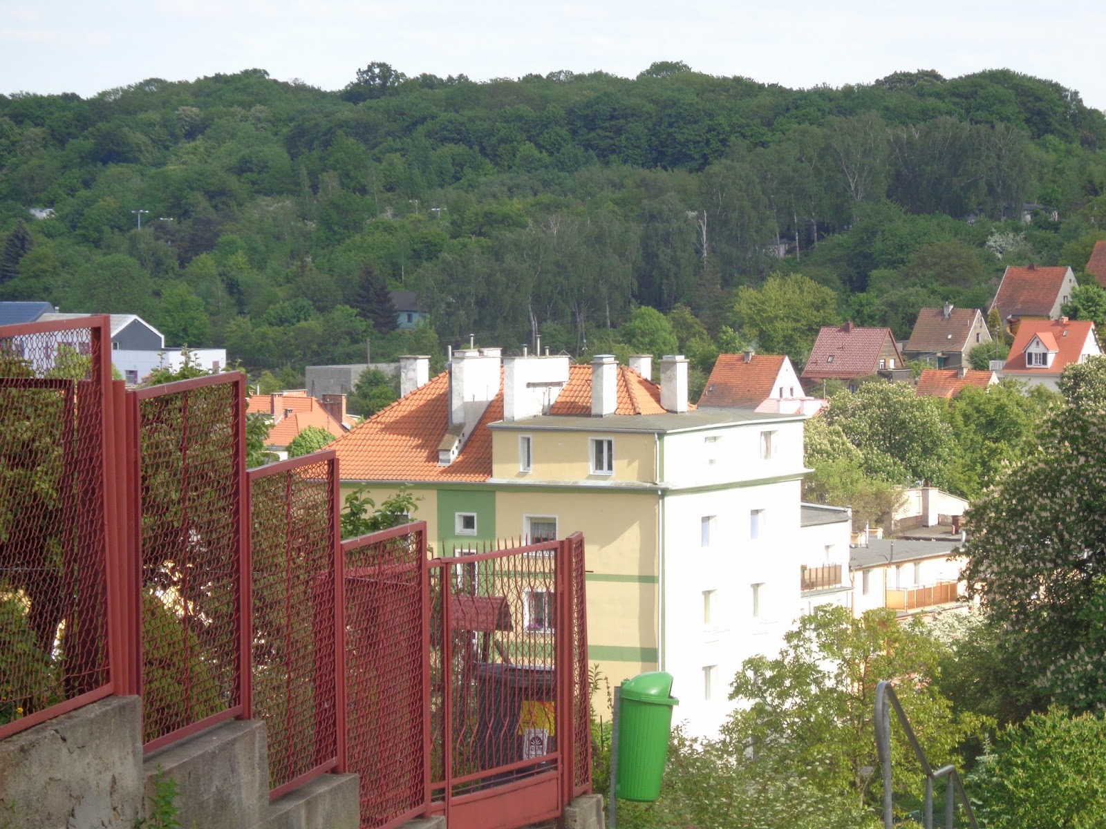 Jaką trasę wybieram ? To jest właśnie najlepsze w moich spacerach, mam w głowie jakieś ramy obszaru, którym mogę iść, ale wybieram różne ulicę, ścieżki, wejścia do lasów itd. Wszystko w zależności od “czucia” miejsca. Po wyjściu z domu zszedłem do ulicy Kartuskiej uliczką Ciasną a następnie przeszedłem bramą na ulice Tarasy. Miedzy blokami dostałem się do Wieniawskiego, po lewej stronie ujrzałem schody. Jak wiadomo, Siedlce niemal codziennie oglądam z góry od strony południowej (ulice Na Zboczu lub Bystrzycka). Widząc schody pomyślałem, że z góry, od tej północnej strony, może być ciekawy widok. Powoli, nigdy jeszcze tędy nie idąc, stopień po stopniu, wchodzę, obracam się i… jest ! 🙂 Widać lasy Biskupiej Góry, kilka budynków z centrum miasta jak chociażby kawałek wieży Bazyliki Mariackiej oraz tereny sporo dalej położone.