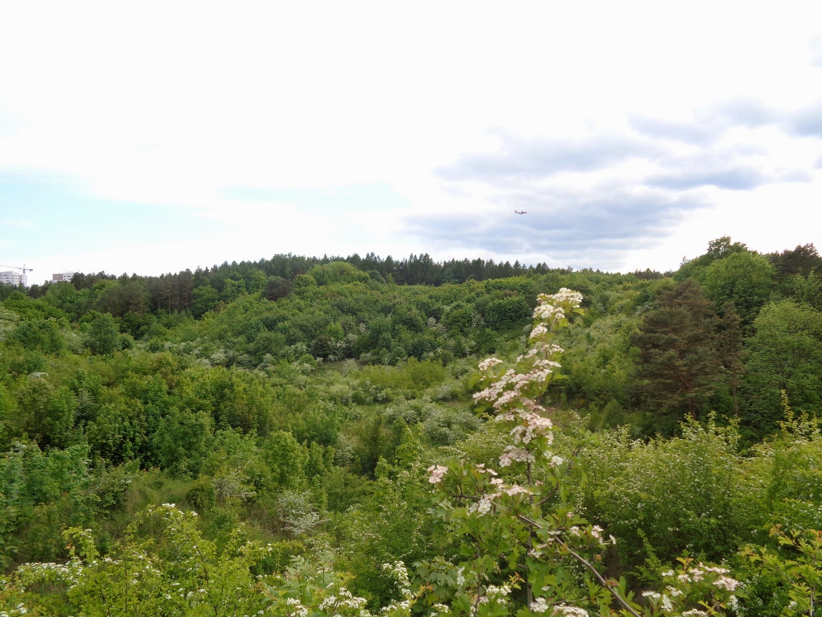 Zszedłem z powrotem w dół i gęstym lasem przeszedłem do terenu zwanego “Dawnymi Garnizonowymi Składami Amunicji”. Są to dwa wąwozy, gęsto porośnięte roślinnością. Po bokach wysokie, zielone ściany, piękne widoki i cisza. Ujrzałem wysoko na wzniesieniu po prawej stronie drewnianą konstrukcję i od tego momentu tam właśnie zechciałem się dostać. Okazało się to bardzo trudne. Wszedłem trochę wyżej, stanąłem by zrobić kilka zdjęć, gdyż drzewa z niebem wspaniale korespondują. Wyżej wejść nie wszedłem ze względu na brak jakiejkolwiek dróżki oraz gęstość roślinności. Udałem się dalej ścieżką w dole wąwozu i otoczony zielenią dotarłem do początku drugiej doliny. Pomyślałem, że być może dotrę do wcześniej zauważonego miejsca od tej strony. No i wszedłem do lasu… Ciężka przeprawa w pozycji ciągle schylonej, dużo podchodzenia, schodzenia, przebijanie się przez gęstą roślinność, spotkanie z sarenkami i…. doszedłem – pomyślałem. Jak się okazało nie było to miejsce, które sobie obrałem za cel, ale… Widok znakomity. Przede wszystkim widok w dół, mnóstwo zieleni i wystające zza lasu budynki osiedli “Wzgórze Magellana” oraz “Central Parku”. Patrząc bardziej w prawo widzę więcej, dalej, lepiej… To kolejny tego typu krajobraz, który odkryłem w ciągu kilku dni. Niestety nie doszedłem do miejsca z drewnianą konstrukcją, ale będzie jeszcze na to czas 🙂