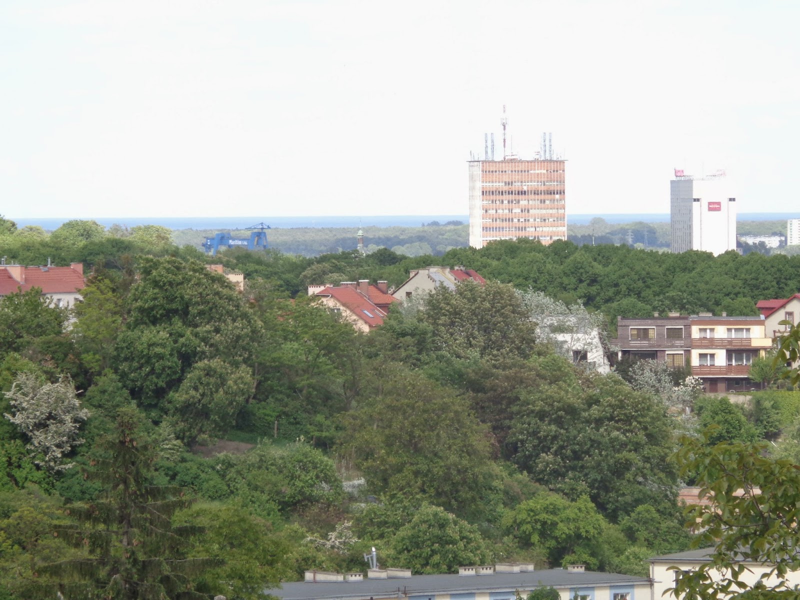 Schody zaprowadziły mnie do ulicy Zakosy, gdzie po drugiej stronie domy przy najpewniej Skarpowej ładnie “tona” w zieleni 🙂 Dalej udałem się właśnie wcześniej wymienioną ulicą Zakosy. Chwila spaceru, po lewej kończą się domy i jest dróżka oraz schody w dól. Spoglądam przed siebie, w dal i… Przepiękny widok ! Na pierwszym planie, bardziej u dołu zabudowa Siedlec i dużo zieleni a dalej znane obiekty w Śródmieściu dla których tłem jest Bałtyk. Z centrum miasta widać np Basztę Jacek, Kościoły Św. Jana, Św. Mikołaja i oczywiście Bazylikę Mariacką oraz mniej oczywisty Sad Rejonowy. Dalej Most Wantowy, lasy i oczywiście morze. Piękny krajobraz, głównie ze względu na “spotkanie” takich elementów jak budynki w centrum i Bałtyk. Dość rzadko spotyka się takie zestawienie, dlatego więc uważam to miejsce za wyjątkowo piękne. Cóż, idę dalej gdyż cel jest jeden 😉 Kawałek dalej, przy ulicy Brukowej ponownie zauważam wspaniałą perspektywę w stronę Bałtyku, ile jeszcze, pomyślałem…