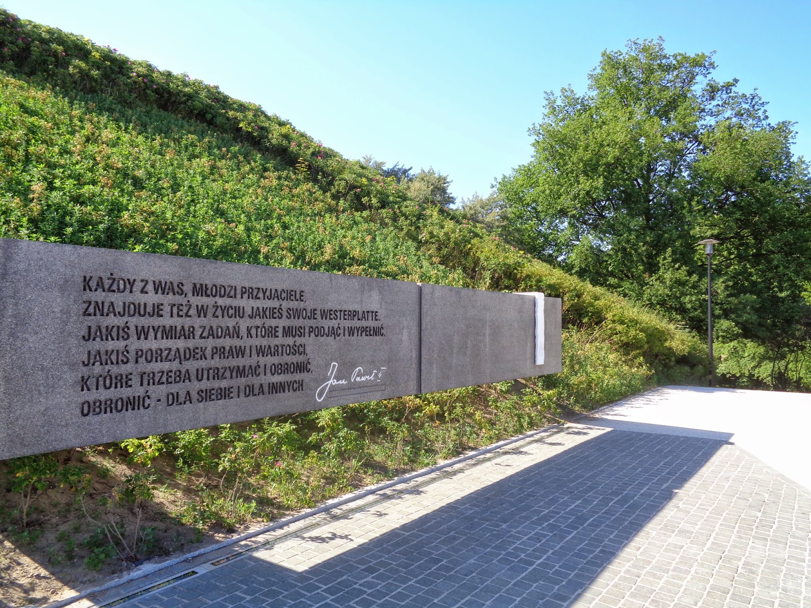 Nie obyło się bez podjechania pod kopiec, na którym stoi znak rozpoznawczy półwyspu, ale coś się zmieniło. Czytałem o pomniku, który ma stanąć u podnóża kopca właśnie na Westerplatte, miał to być pomnik niejako dla Jana Pawła II. Obyło się bez kolejnej rzeźby papieża, za to mamy ścianę/tablice, na której wyryto cytat z Jana Pawła II. Słowa te Karol Wojtyła powiedział własnie na Westerplatte w 1987 roku. Warto będąc tutaj podejść, przeczytać i zastanowić się nad swoim życiem. Nim go ujrzałem, sądziłem, że będzie zbyt wielki, całe szczęście moim zdaniem jest “akuratny” – nie dominuje ani nie znika miedzy zielenią.