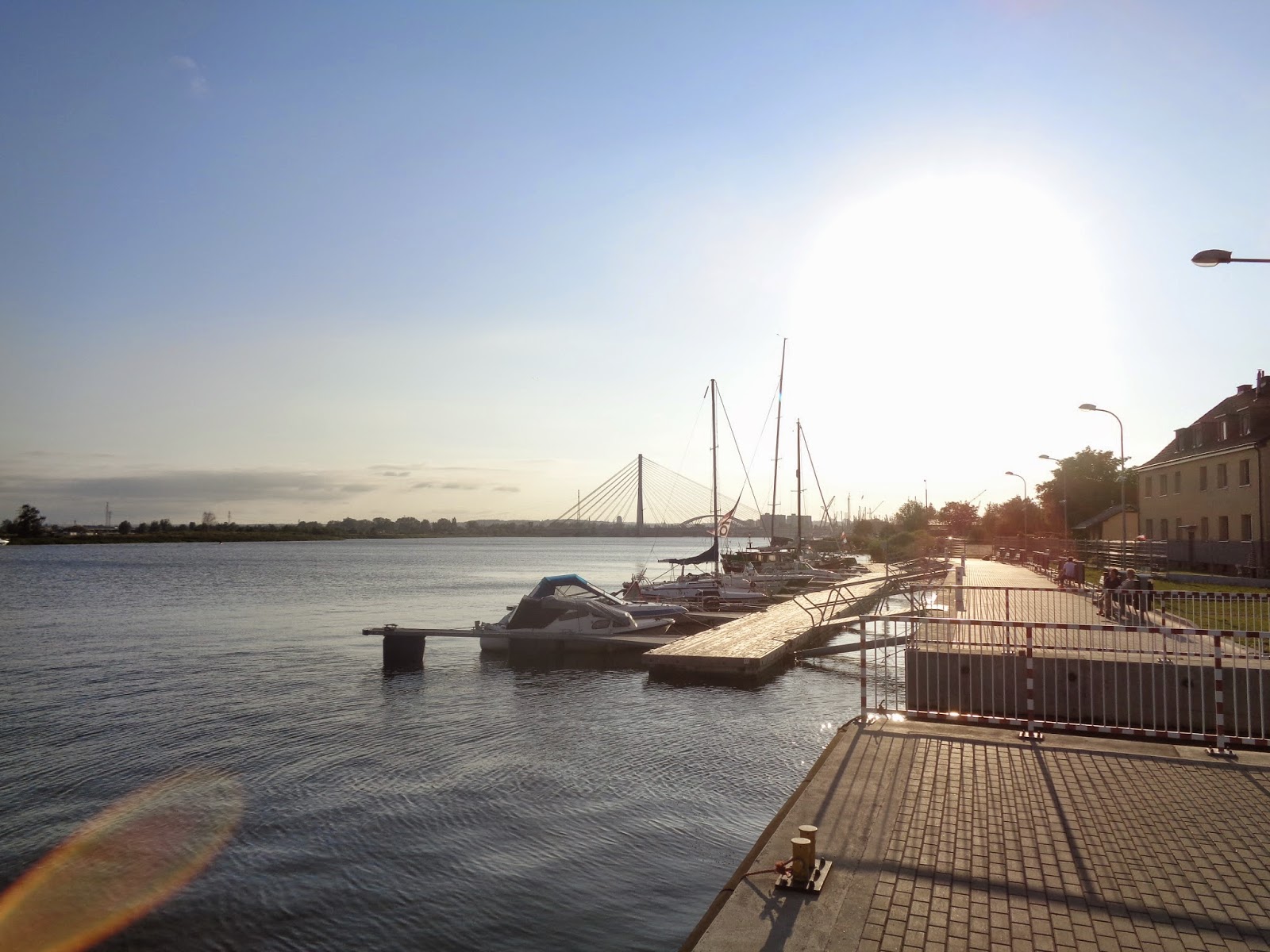 Szczęśliwy pojechałem kawałek dalej, w miejsce już dużo lepiej zagospodarowane. Jest nieduży bulwar z ławeczkami, przystań i genialne widoki, za Mostem Wantowym czają się wieża Bazyliki Mariackiej oraz Ratusza Głównego Miasta. Fajnego klimatu dodają wszystkie łódki/jachty/żaglówki/statki wraz z wodą i zawieszonym dość nisko słonkiem, które odbijając się w wodzie wydobyło z niej niebywały blask. Siedząc tak na rowerze, po zrobieniu jednego ze zdjęć doszło do mnie, że za każdym razem jak jestem na Stogach, robię super (jak na mnie) fotki. Stogi są fotogeniczne, pomyślałem…