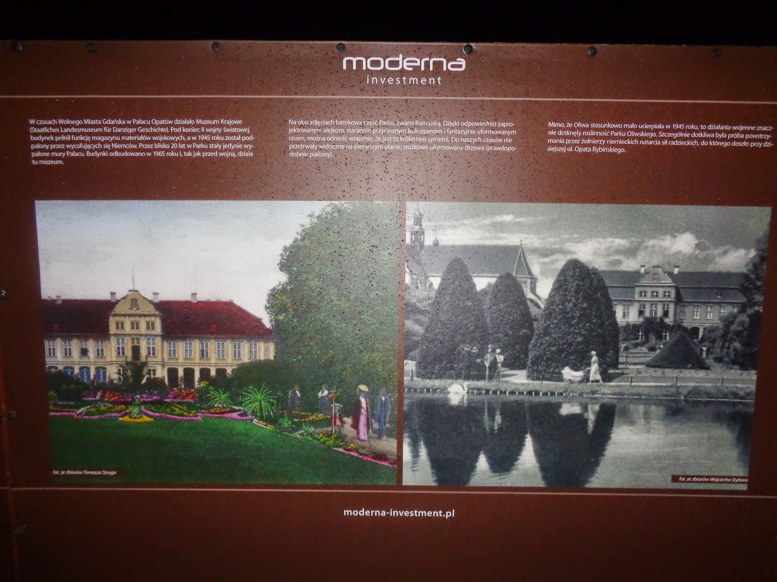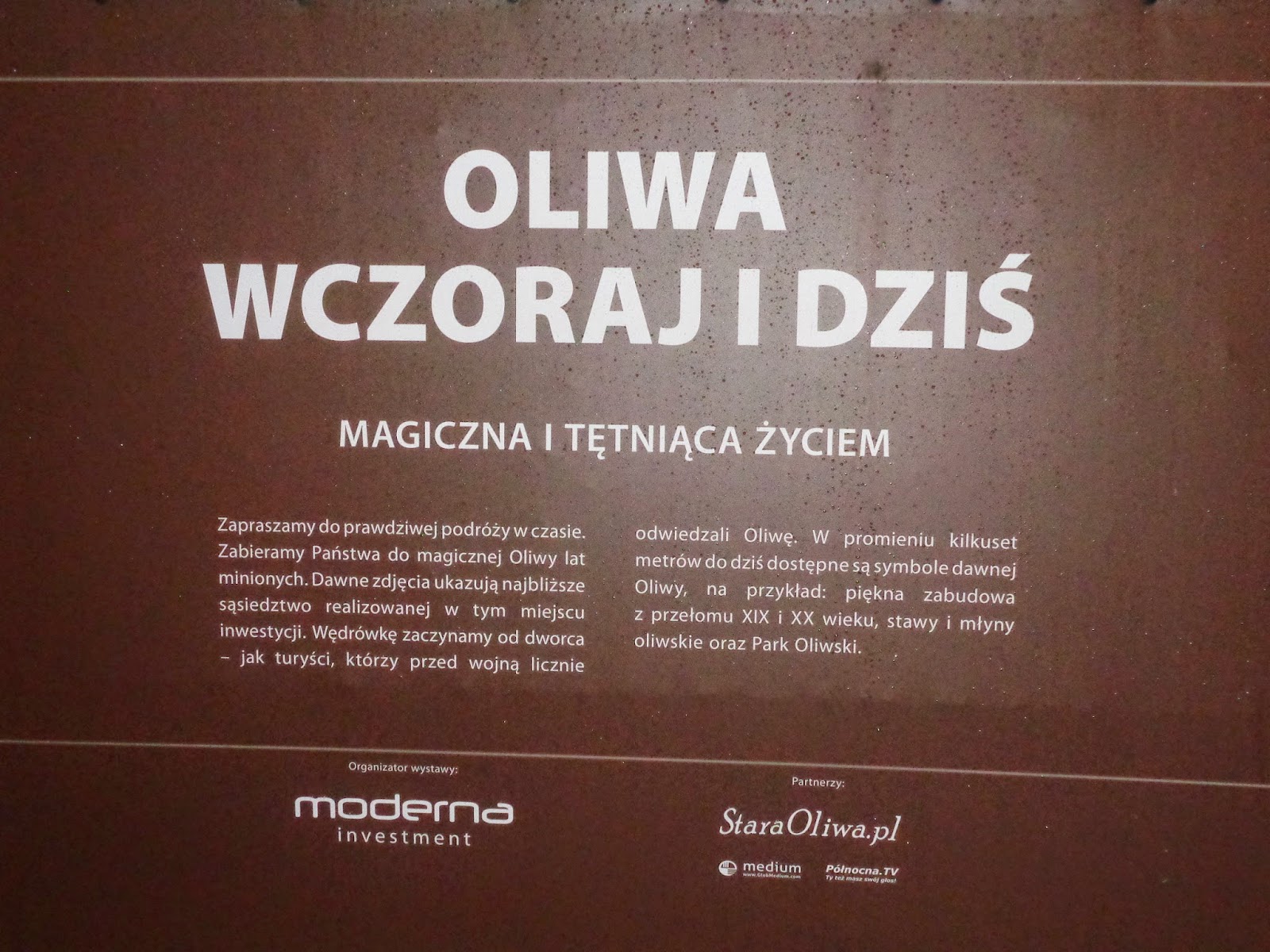 Na płocie każdy chętny może obejrzeć dawne fotografie Oliwy oraz przeczytać sporo ciekawych informacji na temat dzielnicy. Kolejne plansze prowadzą przez dawną Oliwę opisując Dworzec i okolice, Park Oliwski, Oliwskie ulice oraz Pachołek. Kilka informacji mnie zainteresowało. Czytając kolejne opisy zdjęć na ogrodzeniu sporo się nauczyłem i dowiedziałem. Pierwsza informacja z brzegu – w 1874 roku wybrukowano pierwszą ulicę w dzielnicy zaś rok później chodnik. Następnie zobaczyłem zdjęcie kamienicy, która znajdowała się w miejscu dzisiejszego McDonald’sa zaś na innej fotografii nieistniejące obecnie uformowane w stożki drzewka przed Pałacem Opatów w parku.