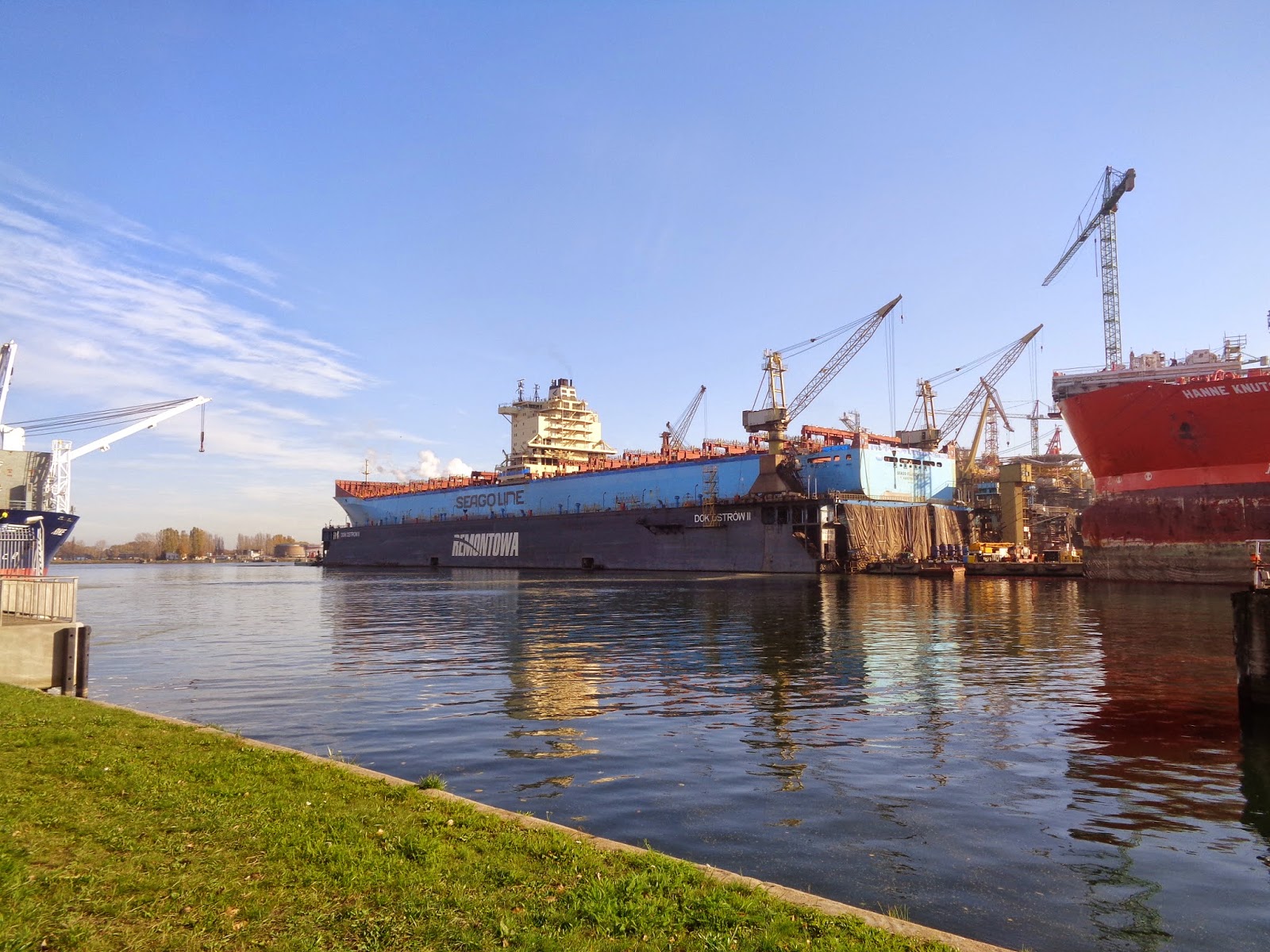 W zamyśle dalsza jazda miała wyglądać tak, iż przejeżdżałbym przy stadionie w Letnicy, lecz będąc już na wielkim rondzie nad tunelem (tym, którym będzie można przejechać pod Martwą Wisłą), skręciłem w lewo w ulice Wielopole, którą dotarłem do ulicy Wiślnej. Jeśli ma się ochotę zobaczyć wielkie statki to właśnie tutaj, vis-a-vis Wyspy Ostrów na której działa Gdańska Stocznia Remontowa im. J. Pilsudskiego. Akurat w doku pływającym D6 stał potężny, niemal 300-metrowy kontenerowiec SEAGO FELIXSTOWE zbudowany w 2006 roku. Obok kolejny olbrzym, długi na 265 metrów tankowiec HANNE KNUTSEN. Obok nich wielkie żurawie, praca wre… Co za widok ! Wtem docieram na most w ciągu ulicy Ostrów, który prowadzi właśnie na wyspę o tej samej nazwie. To kolejne świetne miejsce do obserwacji stoczniowych klimatów, gdyż tuż obok budowane są jednostki w dawnej Stoczni Północnej, obecnie w Remontowej Shipbuilding. Rząd budowanych statków obłożonych rusztowaniami a za nimi słynne, wielkie żurawie KONE ! Nie do przebicia. Za tym industrialnym klimatem można dostrzec budynki z centrum miasta takie jak Hotel Mercure, Organika Trade, “Zieleniak” czy biurowiec Tryton. Z mostu ulicą Swojską, później Twardą i Jana z Kolna dotarłem do Śródmieścia. Ulicami Łagiewniki, Gnilną, Rajską, Podwalem Staromiejskim i przez Targ Drzewny dojechałem do Huciska. Całe skrzyżowanie pokonałem jadąc pasami rowerowymi, co bardzo ułatwia poruszanie się po mieście rowerem. Nowe Ogrody, Kartuska i już niedługo bylem w domku.