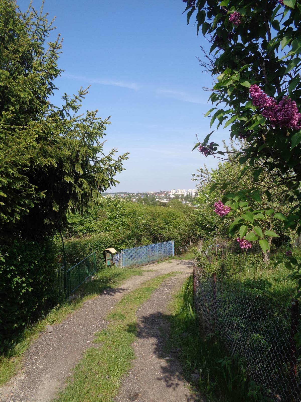 No cóż, do Jasienia nie dojechałem, lecz po prawej mignęła mi brama wejściowa na Ogródki Działkowe “Na wzgórzu”. Nazwa zachęcająca, droga za bramą już mniej, mocno stroma, jednak nie mam w zwyczaju się poddawać i “pokonałem” to wzniesienie 🙂 Jakże to było dobre posunięcie… Widzicie, miałem zapisaną do odwiedzenia ulicą Wiewiórczą, a okazało się, iż była ona “bramą” do poznania zupełnie innego terenu. Po poskromieniu największej stromizny przystanąłem i skręciłem w alejkę po lewej stronie. Całkiem ciekawe widoczki się wyłoniły zza działkowej zieleni… Robi się ciekawie – pomyślałem. Wróciłem na “główną” alejkę i spojrzałem w stronę, gdzie jeszcze kilkanaście minut temu stałem, przy Kościele pw. Miłosierdzia Bożego. Cudowny krajobraz… <3 Pozytywnie zazdroszczę ludziom, którzy mają tutaj działki.