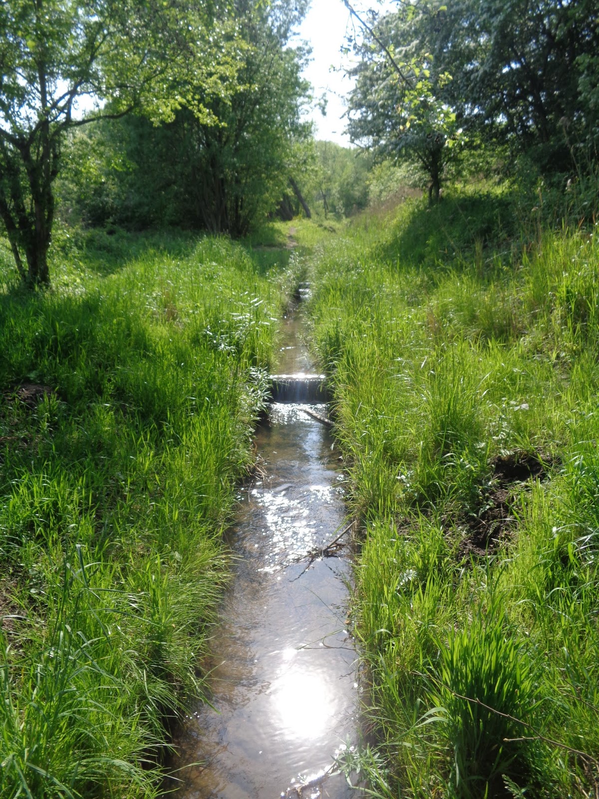 Zjechałem z powrotem do bramy, którą wjechałem na teren działek i skręciłem w prawo, jadąc dalej między drzewkami i krzewami dotarłem do Potoku. Raj na ziemi… Szczerze tak pomyślałem oglądając ten obrazek. Każdy czasami potrzebuje usłyszeć szumu wody, zobaczyć jak odbija się w niej słońce, jak nieustannie płynie… 🙂 Pojechałem kawałek nad potokiem w stronę Jasienia, lecz w pewnym momencie dalej z rowerem nie zdołałem przejść, więc zawróciłem i dojechałem do zbiornika retencyjnego “Myśliwska”.