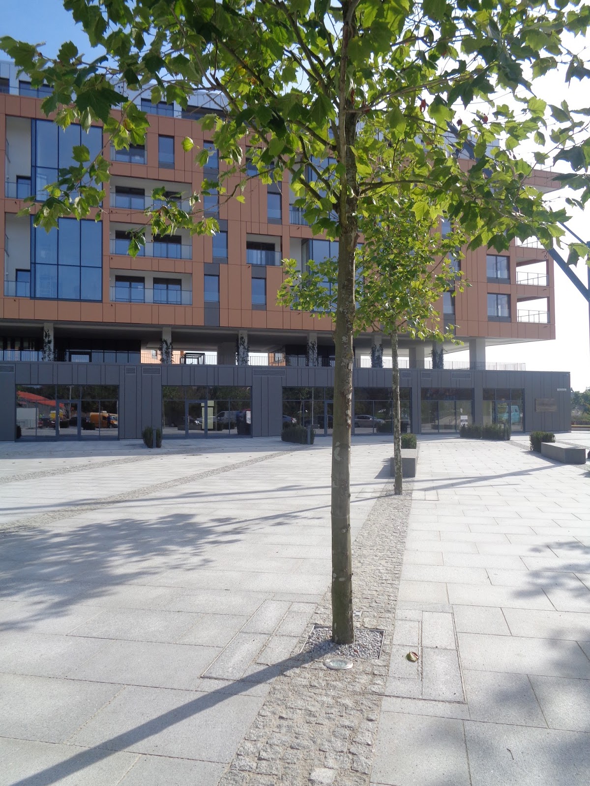 | Od strony ul. Stara Stocznia zaaranżowano plac dodając trochę zieleni w postaci krzewów i drzew. Warto zwrócić uwagę na latarnie 🙂 |