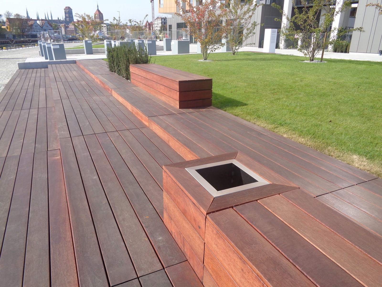 Nad wodą mamy nawierzchnie z drobnej szarej kostki zaś bliżej nowej zabudowy chodzimy po sporych granitowych płytach. Między ciągami pieszymi założono trawniki, dookoła nich zbudowano murki a na nich położono ławki. Nie brakuje niewielkich drzewek, krzewów czy stojaków na rowery. Od strony Motławy z desek zbudowano schody, na których spokojnie można usiąść. Ciekawie w to wszystko wkomponowano kosze na śmieci, zarówno z tej (od Motławy) strony jak i od strony budynków. Pamiętam jak wyglądała ta okolica jeszcze nie tak dawno. Ktoś kto był w tym miejscu dwa czy trzy lata temu i przejdzie się obecnie może tylko przetrzeć oczy i nie dowierzać. Patrząc z nowej miejskiej przestrzeni w stronę Głównego Miasta pomyślałem, że może jeszcze jest szansa dla Gdańska na dobrą, elegancką przestrzeń publiczną w Śródmieściu. Dodatkowo od strony ul. Stara Stocznia mamy plac wyłożony dużymi granitowymi płytami. Między płytami widać pasy ułożone z drobnej kostki. Bardzo fajnie, że latarnie nawiązują wyglądem do stoczniowych żurawi, mamy miejsca do spoczynku a plac urozmaicony jest niską i wyższą zielenią w postaci drzew.