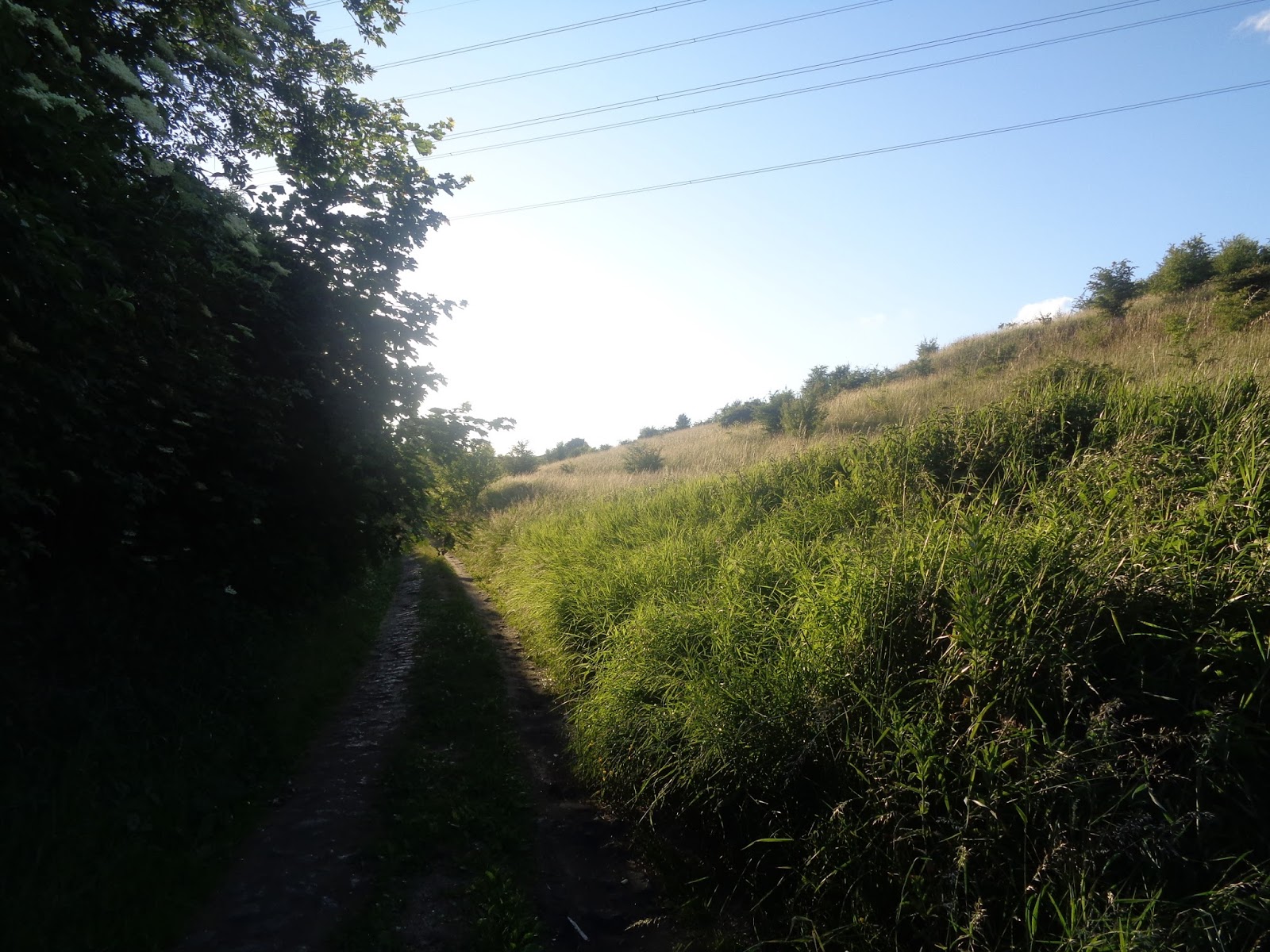 Pojechałem dalej i spontanicznie skręciłem w prawo w stronę ul. Zawilcowej, jednak wówczas zupełnie nie widziałem gdzie jadę. Co więcej, z początku ów zjazd już minąłem, lecz zobaczyłem ciekawie miejsce na wzgórzu… A jak mnie coś zainteresuje, nie ma bata ! 😉 To był moment przełomowy, od tego miejsca trasa potoczyła się w taki sposób, że możecie czytać ten wpis. Czasami wystarczy jedna decyzja. Wjechałem na wąską ścieżkę kierując się w stronę wspomnianego wzgórza. Zza drzew wygląda słońce, jest tajemniczo, nie mam pojęcia co mnie spotka za następnym i kolejnym zakrętem. W życiu również mamy takie momenty, idziemy w nieznane, nie wiemy co wydarzy się za dzień, tydzień lub rok. Czyż nie tak jest ze związkami ? Blask słońca jest jak pierwsze zauroczenie, jest piękny, silny i nie chce puścić. Mimo wszystko patrzymy w tamtą stronę. A co gdy słońce zajdzie ? A zachodzi każdego dnia. Jednak nawet gdy zachodzi, nadal świeci… 😉 Ruszam dalej mając po obu stronach zielone wzniesienia i po kilku minutach po lewej stronie zauważam ścieżkę prowadzącą na wzgórze.