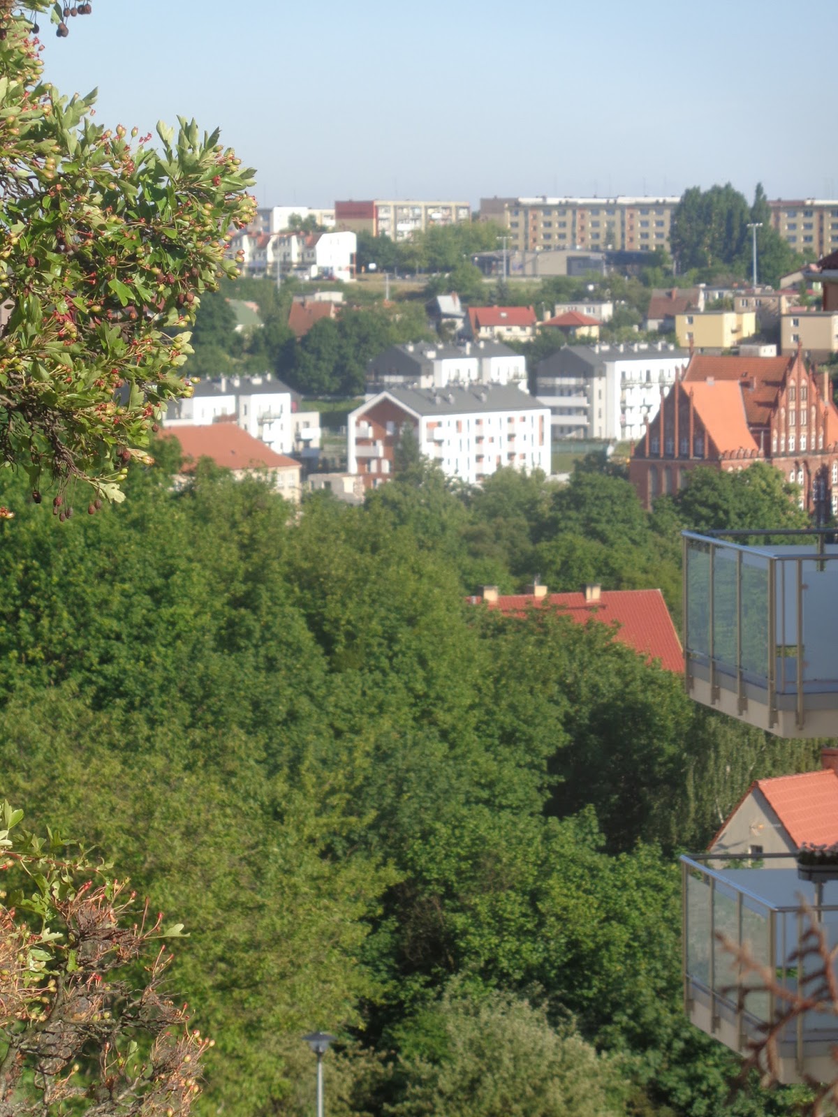 Postanowiłem przejść ul. Powstańców Warszawskich nad osiedlem “Południowy Stok” i między blokami wypatrywać ciekawych widoków. Widać przede wszystkim bloki na Siedlcach oraz dalej Chełm. Skręcam w prawo na ul. Nad Jarem i dalej w ul. Goszczyńskiego. Przy tej drugiej ulicy usytuowano osiedle “Południowy Stok” i trzeba przyznać, mieszkańcy mają całkiem ciekawe widoki! Podchodząc do barierki widzę zieloną skarpę, dalej zabudowę Siedlec przy ul. Bądkowskiego, która wznosi się coraz wyżej aż do bloków przy ul. Paderewskiego. Dostrzegam dachy domów na Wzgórzu Mickiewicza oraz wieże Kościoła Św. Franciszka z Asyżu.