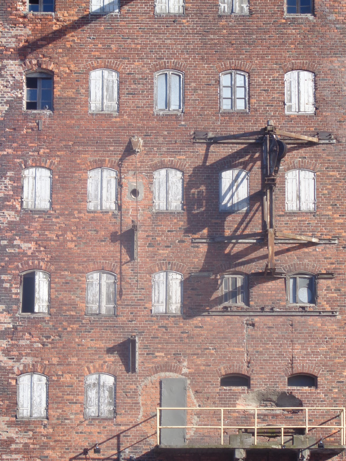 1. Zaczynamy fasadowo. Spichlerz wyjątkowy, bowiem jako jeden z nielicznych przetrwał wojnę. Przed wojną był jednym z najmłodszych, obecnie najstarszy (płn cypel). Miasto nam się zmienia.