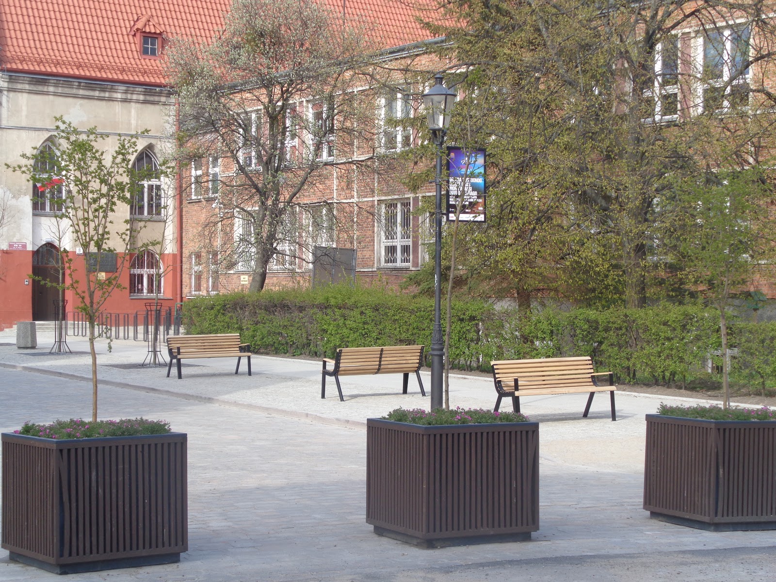 Właśnie takie zastosowano przy okazji remontu i przeznaczenia na deptak ul. Grobla IV. Spełniają podwójną rolę, grodzą przejazd kierowcom aut a dodatkowo rosną w nich drzewka. Grobla IV zyskała podobnie jak Straganiarska “równą kostkę” brukową w kolorze szarym, chodnik (po wschodniej stronie) wyłożono dużymi szarymi płytami granitowymi, zaś ciąg z nowymi ławkami i posadzonymi drzewkami drobną kostką. Kiedy robiłem zdjęcia do tego artykułu (19 kwietnia) na ulicy stało kilka starych betonowych koszy na śmieci. Miejmy nadzieje, że to tylko chwilowe i niedługo zastąpią je bardziej estetyczne meble miejskie.