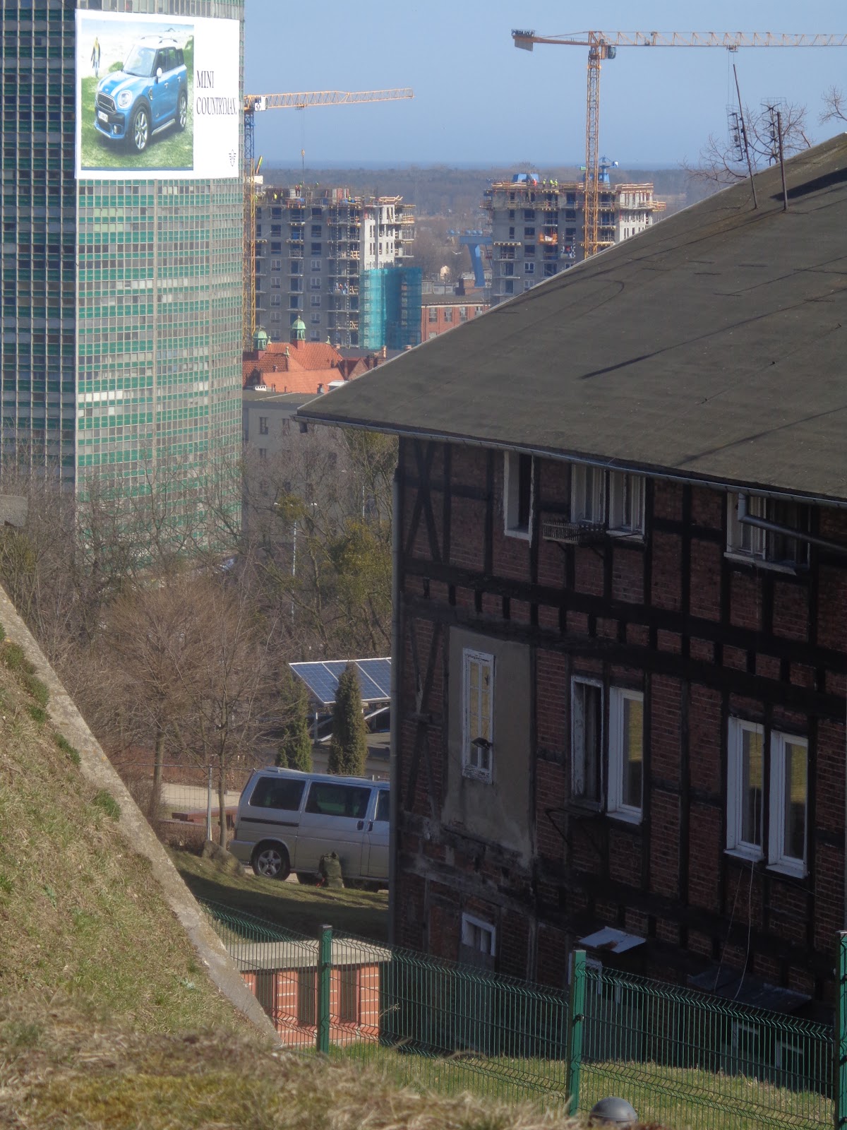 Szedłem jak gdyby po schronach mając nieco inną optykę miejsca. Pierwszy widok, jaki przykuł mój wzrok to wspaniałe w moim odczuciu zestawienie remontowanej właśnie Wozowni Artyleryjskiej na pierwszym planie, fragmentu ziemnego nasypu obok z Zieleniakiem i budowanymi blokami “Bastionu Wałowa”. Patrząc z daleka nowe bloki zdają się być nawet ciekawe, coś w końcu wypełnia krajobraz. Z drugiej strony architektura pozostawia wiele do życzenia, o urbanistyce nie ma co wspominać.