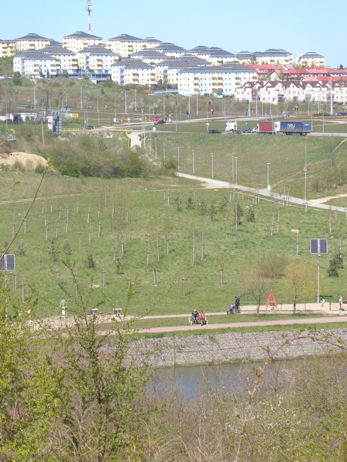 Drugim miejscem, które chciałem tego dnia odwiedzić było wzgórze nad wspomnianym zbiornikiem. Do pewnego momentu pomagają schody, zaś dalej zagłębiłem się w gęstwinie krzaków i drzewek. Między zielenią wypatrywałem stawu i w końcu go znalazłem ! U dołu woda, wyżej zieleń i wzgórze z Osiedlem Pogodnym, którego ulicami kilka chwil wcześniej spacerowałem.