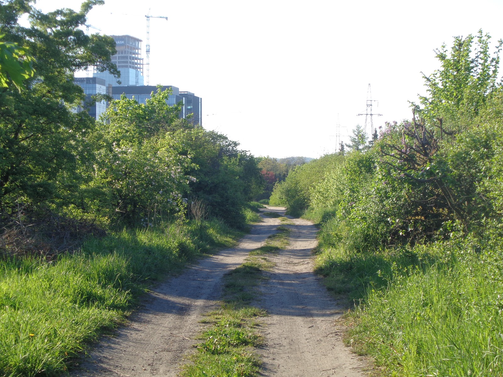 Udaliśmy się na drugą stronę torów, które są niczym granica między dwoma zupełnie innymi światami. Wcześniej wysokie, szklane biurowce, teraz krzywy chodnik, wiodący równolegle do torowiska, bujna roślinność i niskie domki. Spacerując w stronę Zaspy, co jakiś czas odwracaliśmy się, uwieczniając kontrast tej (domkowej, działkowej) strony z tą z drugą (biurową).