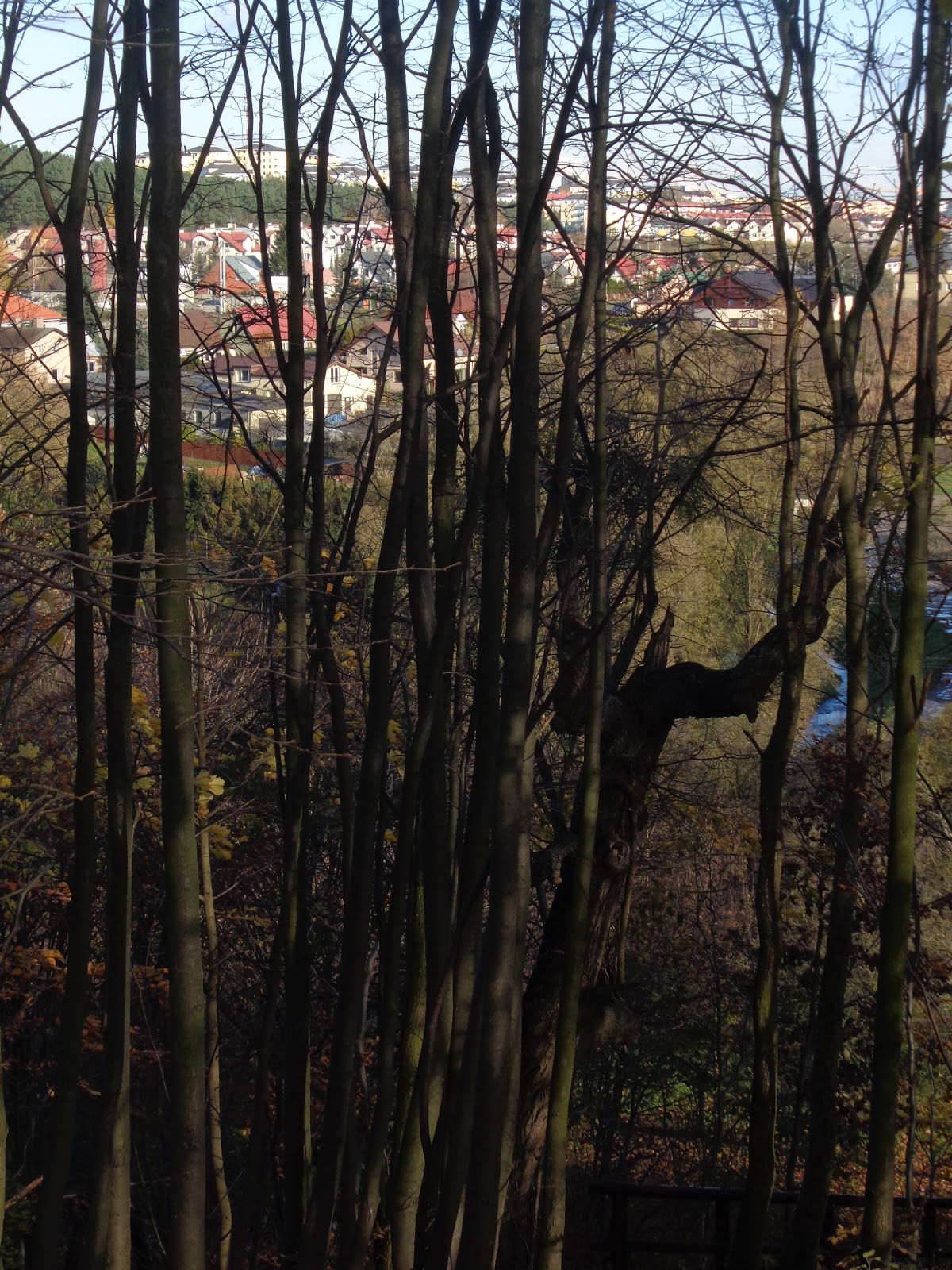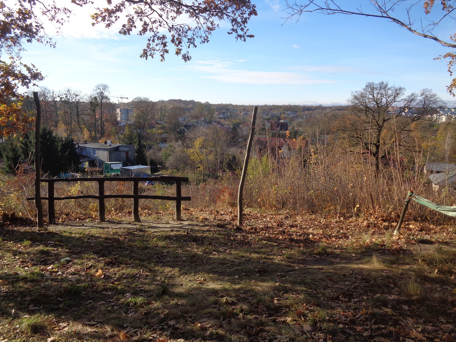 Musze przyznać, że zawiodłem się jeśli idzie o spojrzenie na stronę północną i północno-wschodnią, gdzie nie przerzedzono drzew, nie tworząc choćby wąskich osi widokowych. A jest co oglądać, mamy bowiem Kozacze Wzgórze z widoczną w oddali zabudową Osiedla Pogodnego.