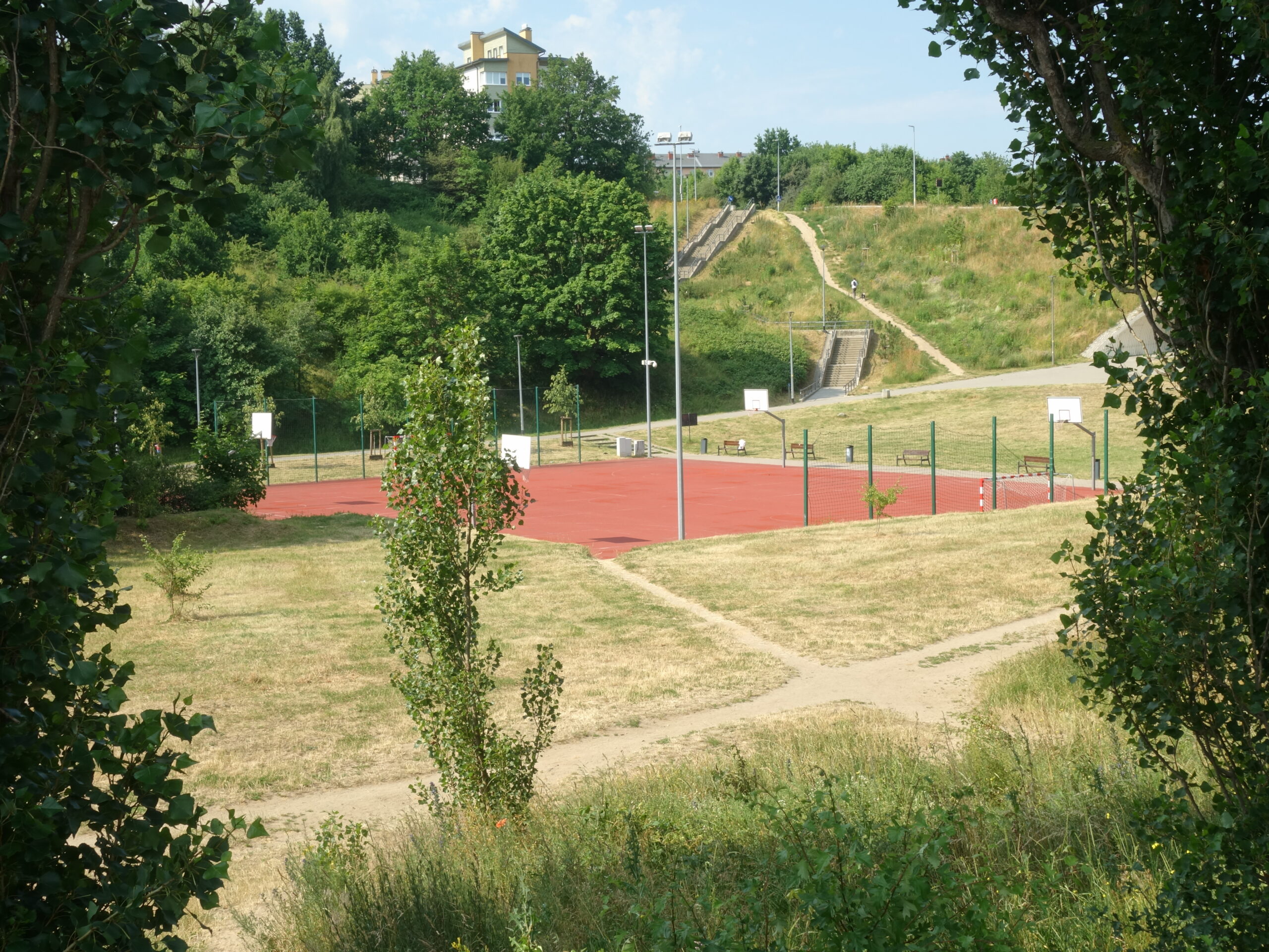 Alejką za szkołą, dojechałem do ulicy Porębskiego, skąd zjechałem na punkt widokowy na zbiornik retencyjny “Świętokrzyska II”. To jeden z moich ulubionych niedawno odkrytych widoczków! Doskonale widoczny zbiornik z wyspami, górki wokół niego, osiedlowe bloki/domy.