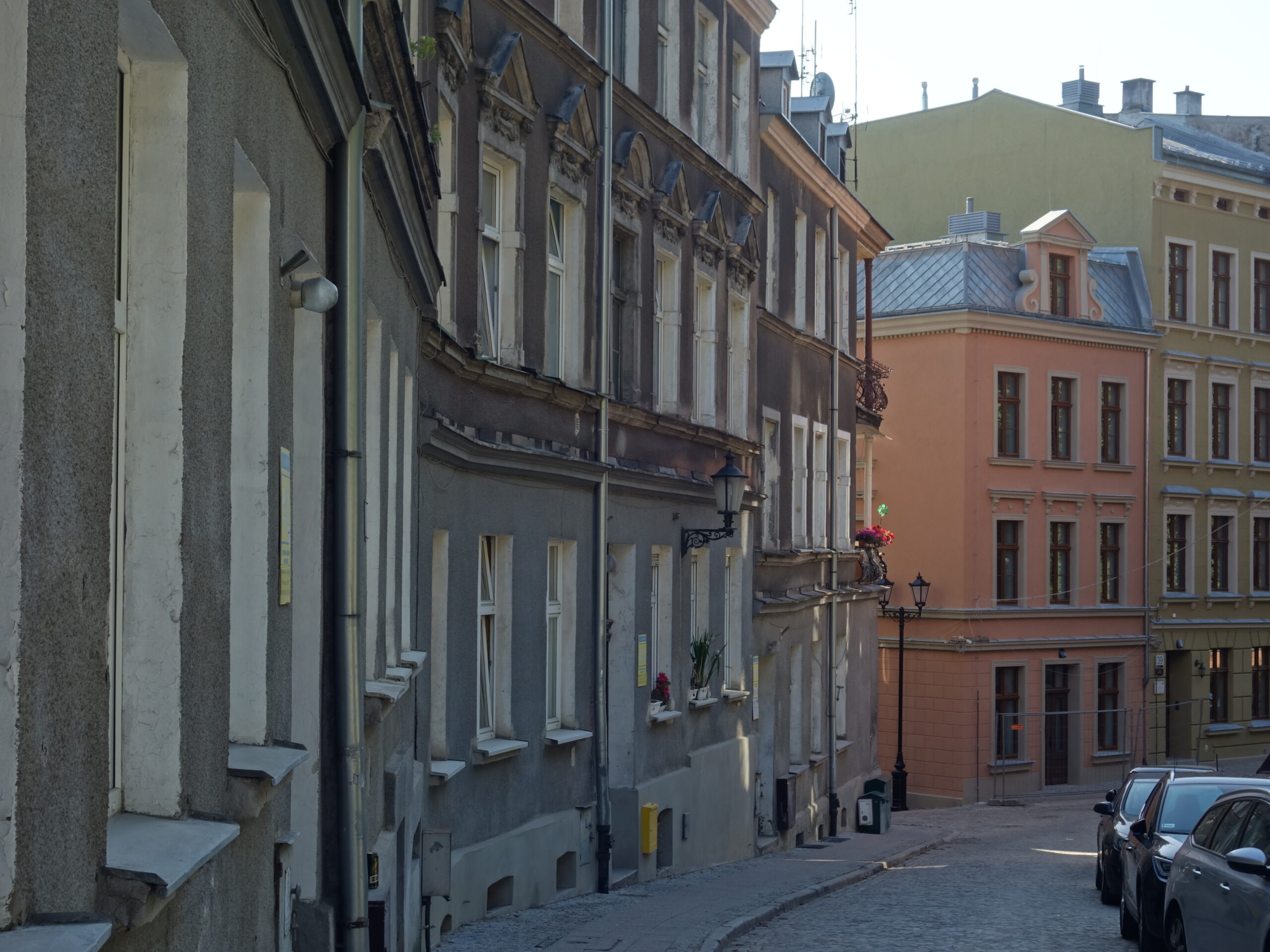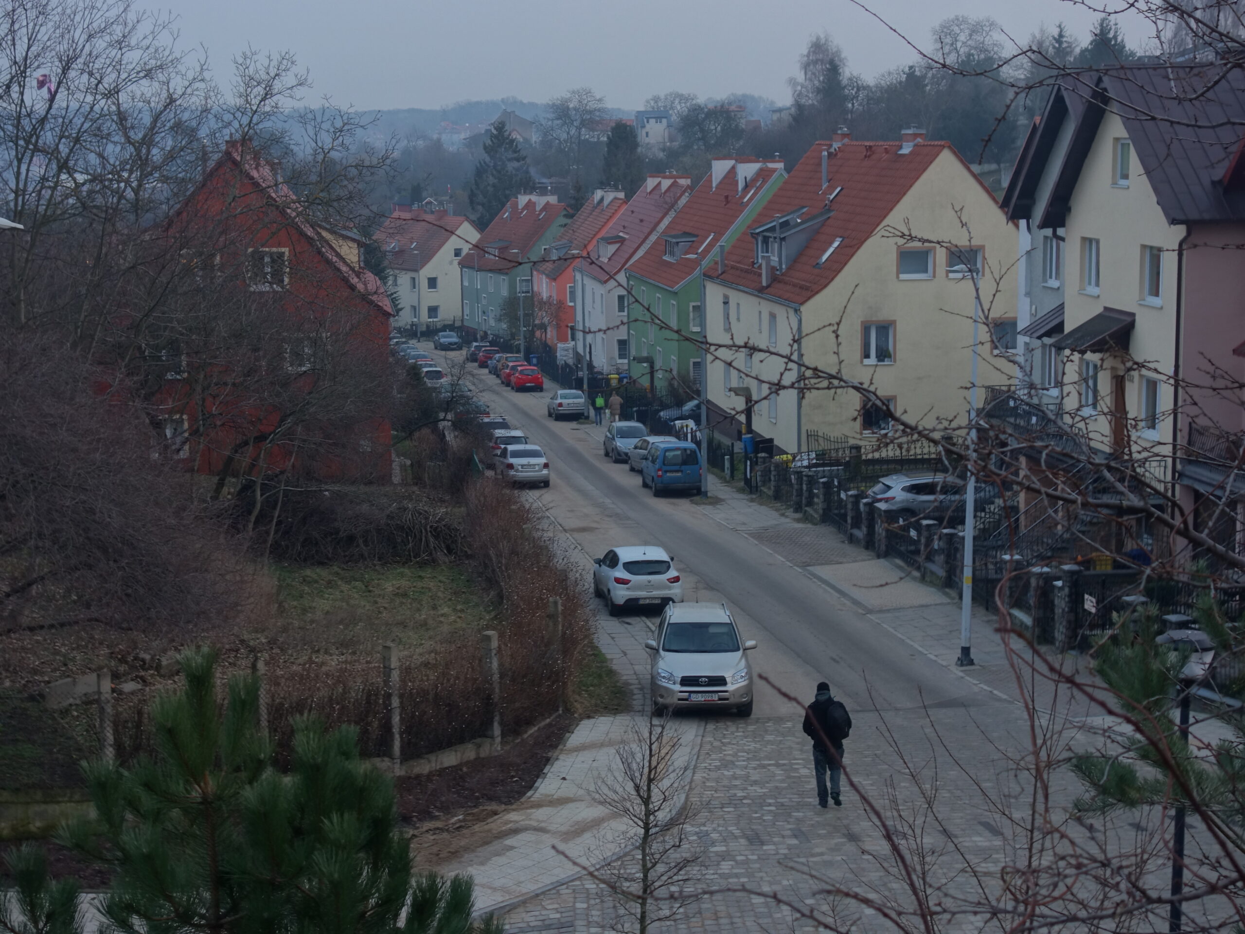 Gdy zakiełkowała mi myśl o wpisie o tej tematyce, ulica Biskupia jako pierwsza wskoczyła na listę. Biskupia wspina się bowiem na wzgórze, startując w okolicy Węzła Carla Groddecka, kończąc zaś przy dawnych koszarach. Szczególnie stromo jest za skrzyżowaniem z ulicą Na Stoku, gdzie po zakręcie w lewo, następuje spora deniwelacja terenu. Na odcinku 300 metrów wchodzimy ponad 20 metrów w górę. Ponadto Biskupia jest zabudowana kamienicami z przełomu XIX i XX wieku, co dodaje jej historycznego charakteru.