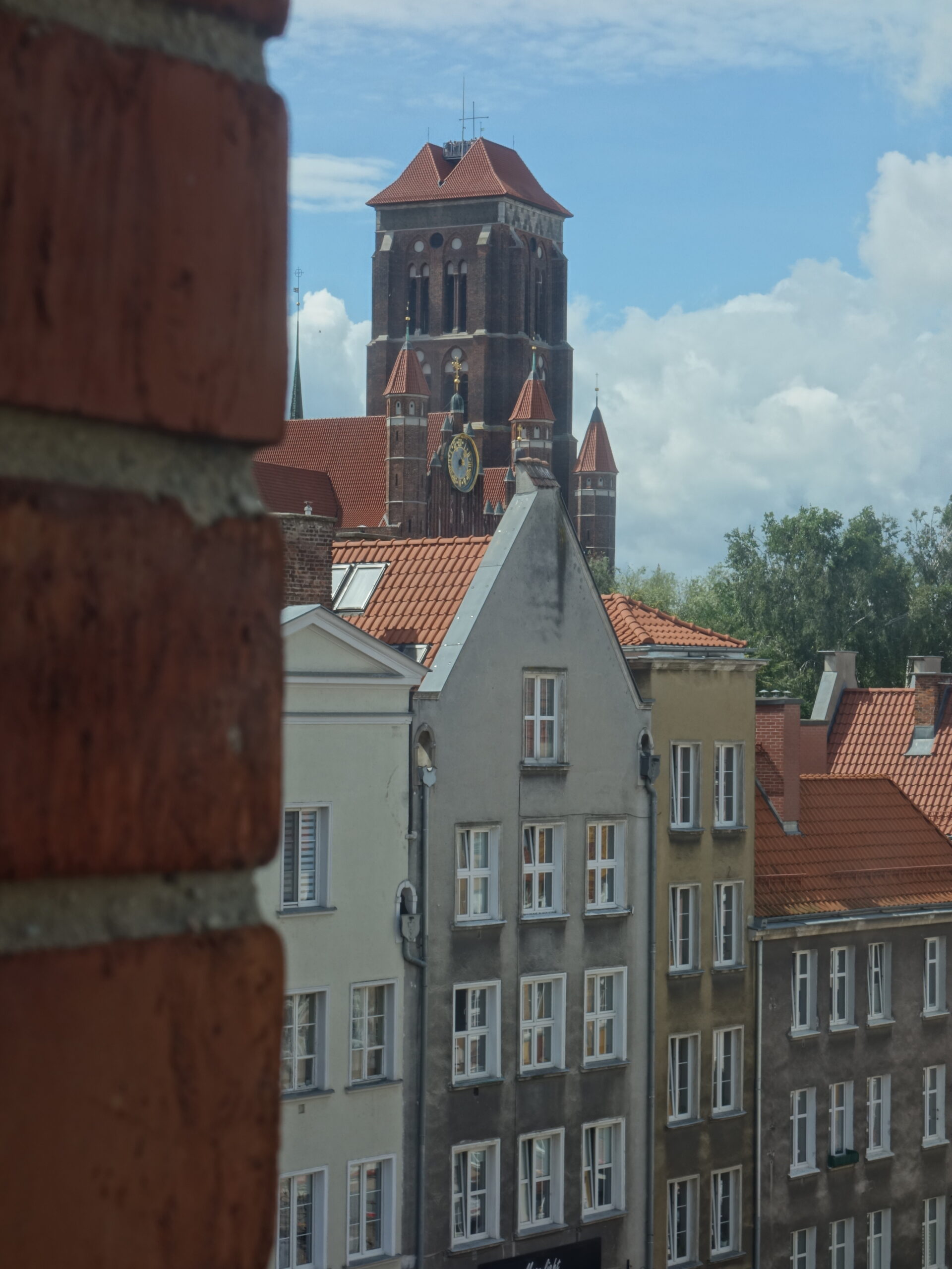 W czasie Jarmarku Św. Dominika, razem z Mamą, wybraliśmy się na ostatnie piętro w Ośrodku Kultury Morskiej, do restauracji “Cała Naprzód”. Zrobiłem trochę zdjęć z tarasu widokowego od strony Motławy, lecz bardziej zaskoczył mnie widok z toalety. Kamieniczki przy ulicy Szerokiej, a nad nimi potężna ceglana bryła Bazyliki Mariackiej. Taki nietypowy punkt widokowy.