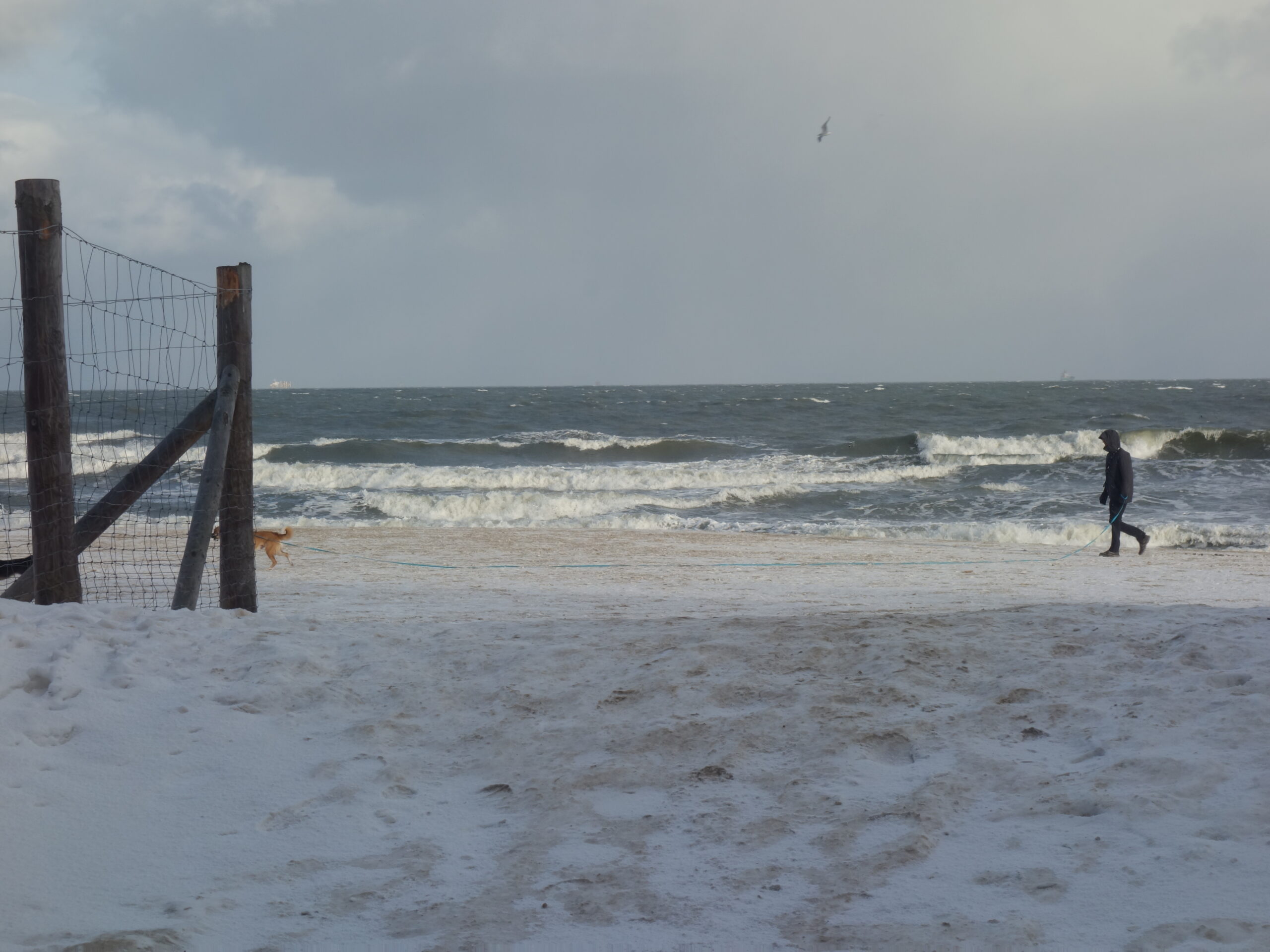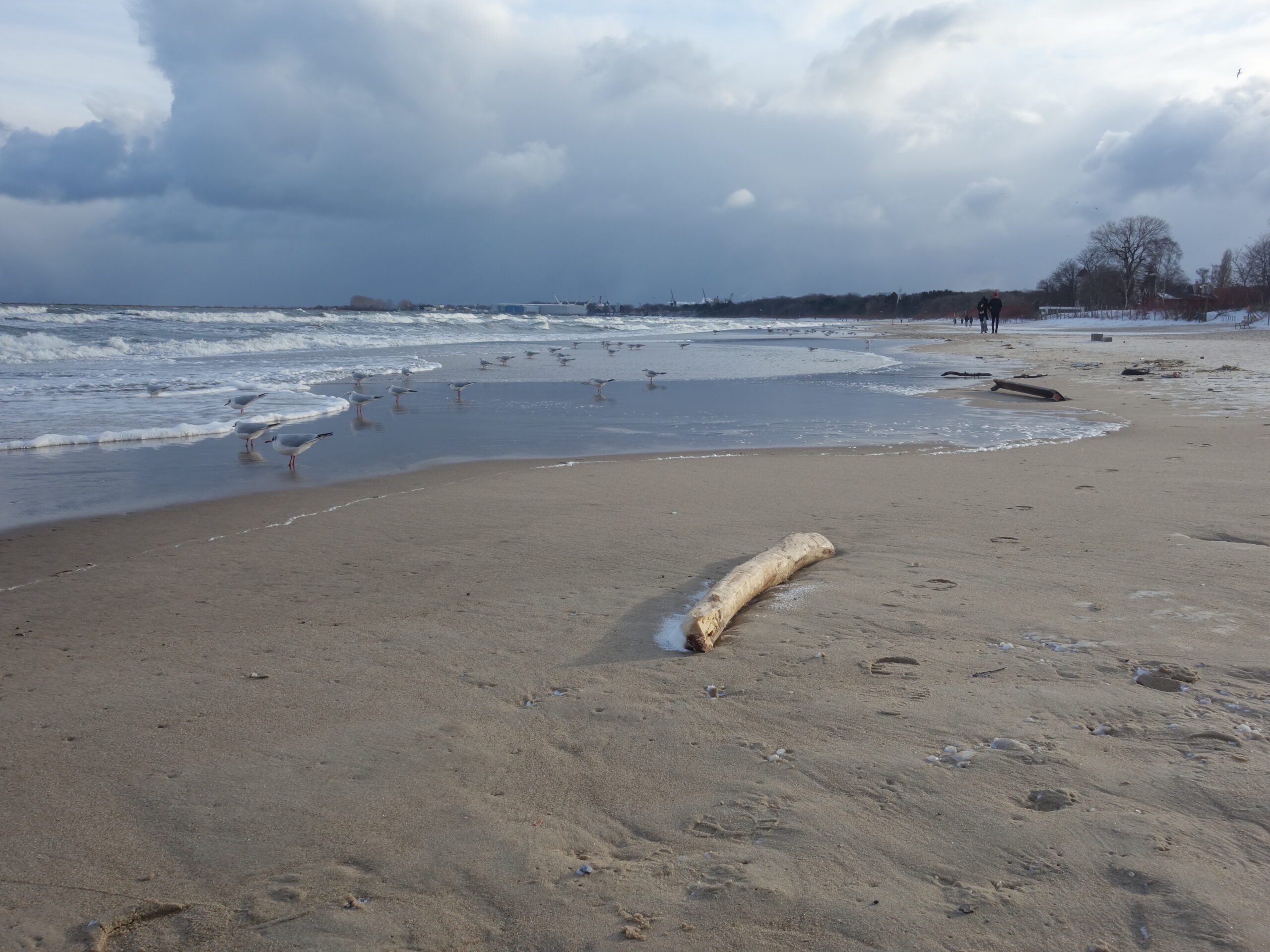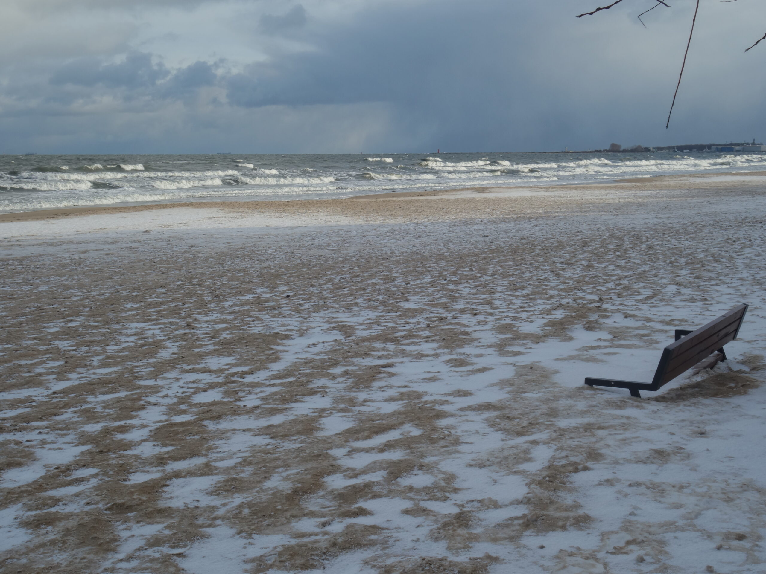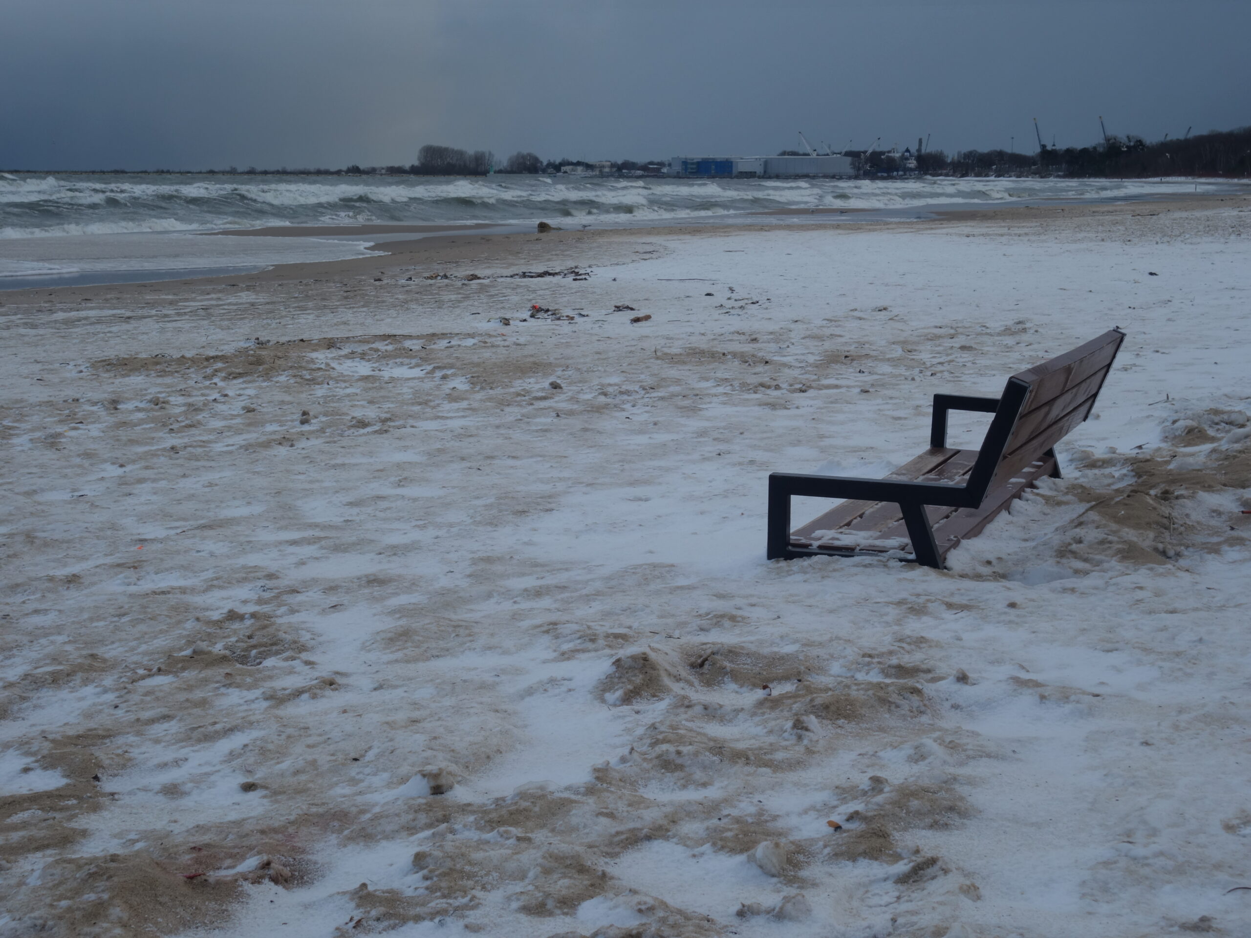 Doszedłem do jednego z wejść na plażę z miejsca się zachwyciłem! Przepiękne uczucie, być jednocześnie w dużym mieście, ale móc zderzyć się z nieokiełznaną naturą. Zakopana w piachu i śniegu ławka, fale bijące o brzeg, jedna za drugą, z całą mocą. Wiatr dawał się we znaki, zaczepiając tuptające plażą ptaki. Kilka chwil i poczułem, jak bardzo mi tego brakowało. Tego wiatru, tej przestrzeni, tego hałasu, tej siły, tego piękna.