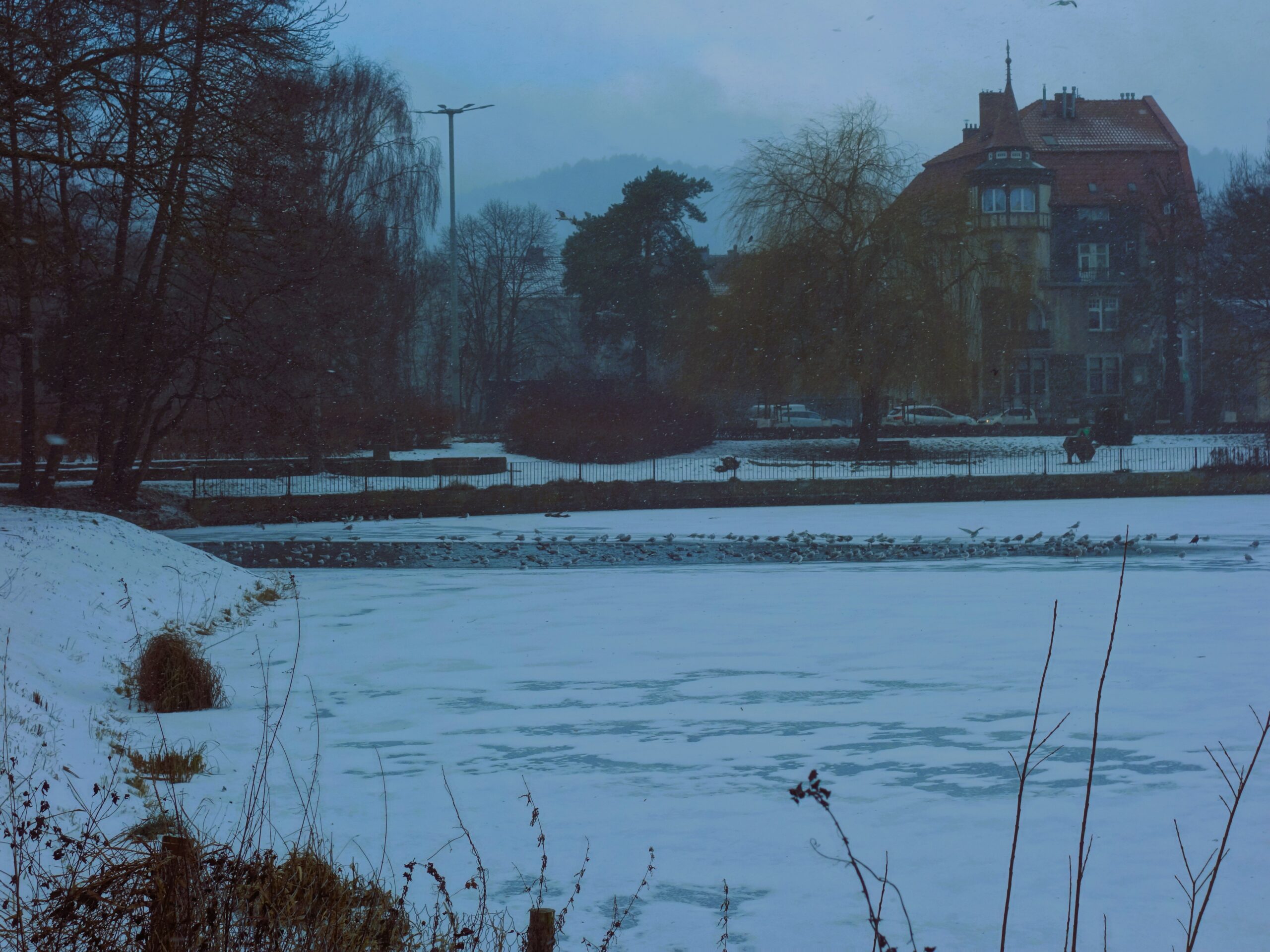 Nad zbiornikiem retencyjnym przy Al. Grunwaldzkiej, a inaczej Stawem V Młyna, sfotografowałem skutą lodem taflę wody, jedną z kamienic przy Grunwaldzkiej i zarys morenowego wzgórza. Spodobało mi się to zdjęcie, gdyż jest symbolem drogi i miejsca, do którego zmierzałem.